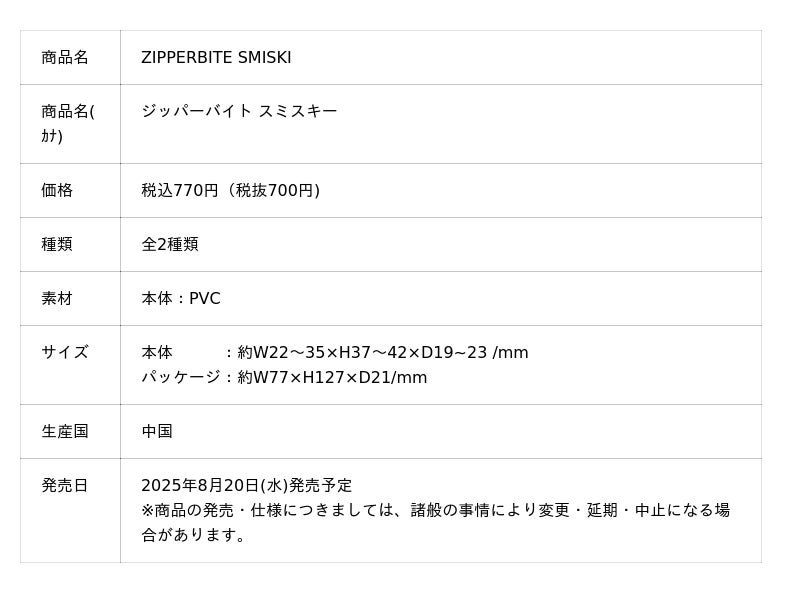 今回発売される『ZIPPERBITE SMISKI』第2弾では、「Yoga Series」より「ハススキー」、「Moving Series」より「コロブスキー」の2種類が登場。お好みのスミスキーを“ジッパー”につけて、新感覚でユニークなおしゃれをお楽しみください。