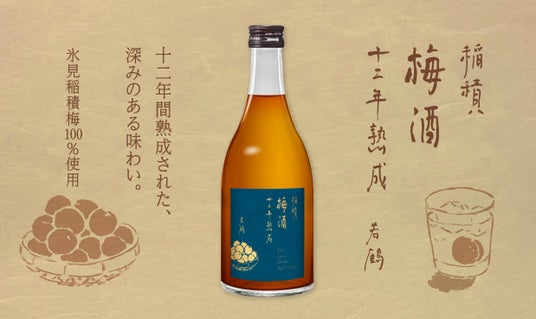 稲積梅は富山県のような雪深い地域に順応した品種。小ぶりだが肉厚な果肉、程よい酸味と強い旨みを特徴としています。この稲積梅を自社製造の日本酒にゆっくり漬けこんで、しかる後に梅を取り出し、十二年間の長期熟成を行いました。稲積梅の個性を活かしつつ優しい甘味を添えて。熟成による口当たりのまろやかさと奥深さ、圧倒的な濃厚さを加えて。リッチさが際立つ大人なリキュールに仕上げました。まずはストレートで飲んで頂きたいこだわりの一品です。