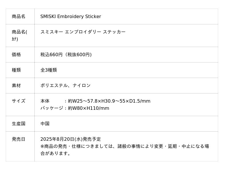 『SMISKI Embroidery Sticker』 ラインナップ(全3種)