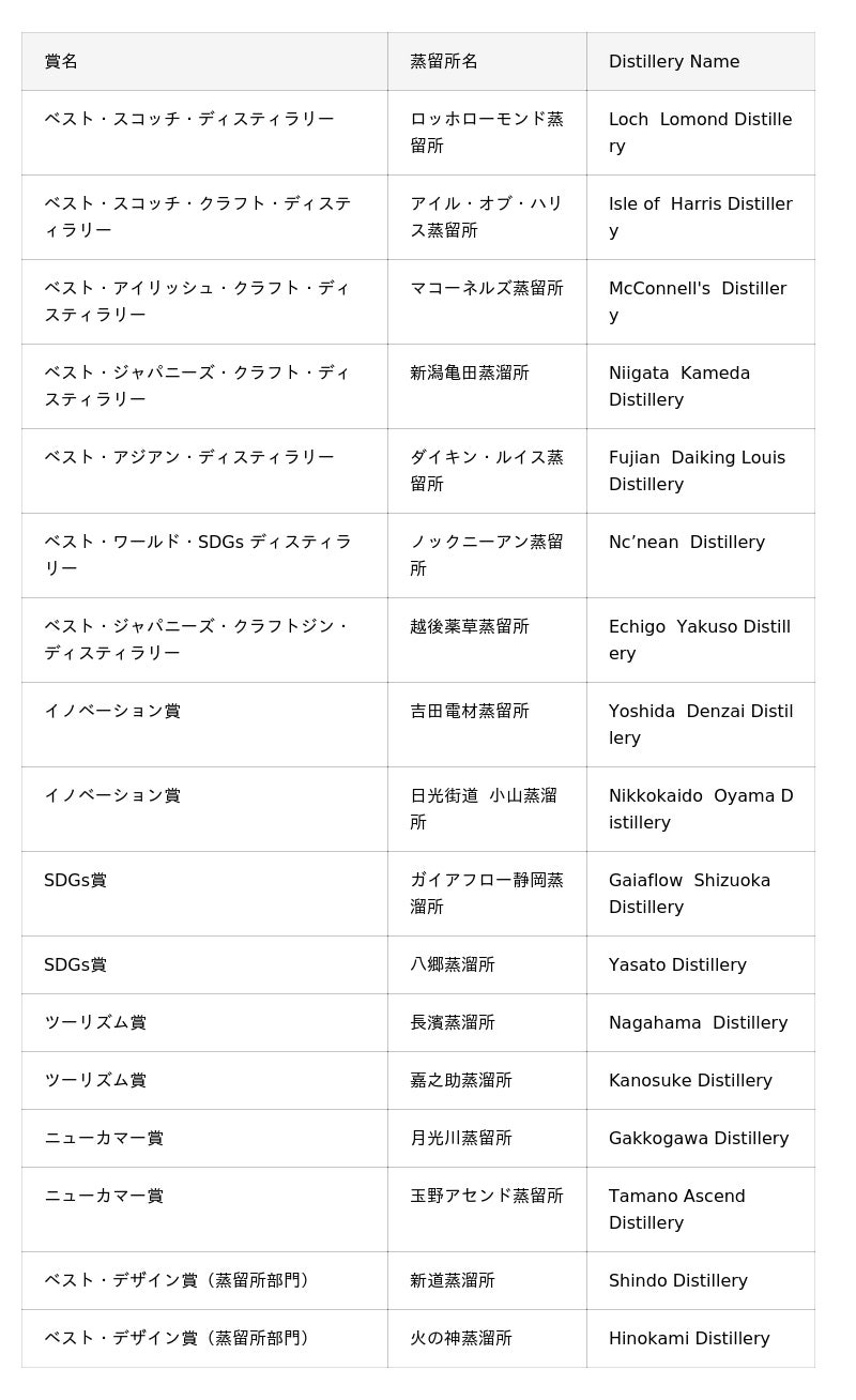 東京ウイスキー&スピリッツコンペティション(TWSC)2025 ベストディスティラリー賞発表