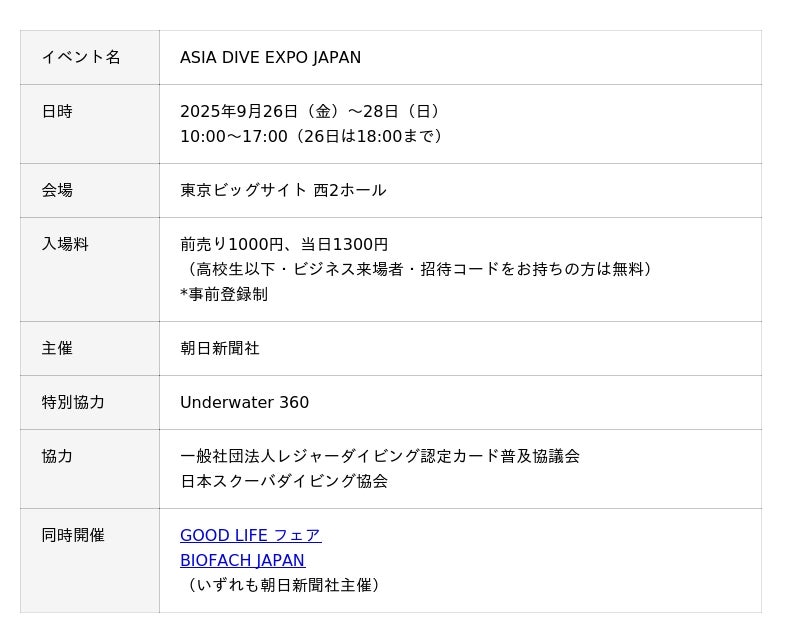 株式会社朝日新聞社(代表取締役社長CEO:角田克)は、海とダイビングのイベント「ASIA DIVE EXPO JAPAN」を9月26日(金)~28日(日)、東京ビッグサイト(東京・有明)で開催します。ダイバーやダイビング事業者はもちろん、まだダイビングをしたことがない方、親子連れなど、前回1.7万人が来場したイベントの第2回です。入場登録を、公式サイトで受け付けています。入場には、事前の登録が必要です。