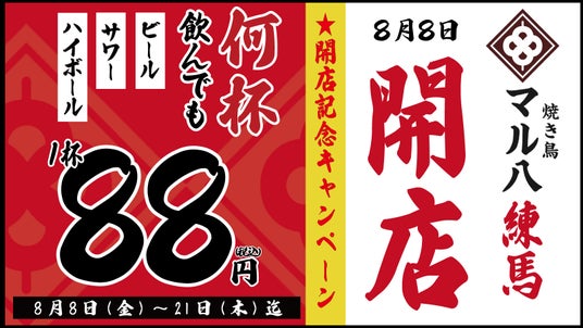 【生ビール・ハイボール・サワーが何杯飲んでも1杯88円!「焼き鳥 マル八 練馬」が開店を記念して8月8日(金)~8月21日(木)の期間限定で開催