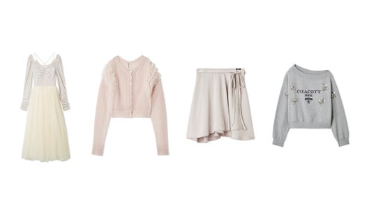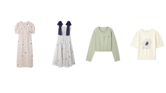 シフォン素材で、歩くたびにふわりと揺れるシルエットが魅力のフラワープリントショルダーリボンワンピースや、お花モチーフのビジューボタンがポイントのカーディガンなどラインアップ。