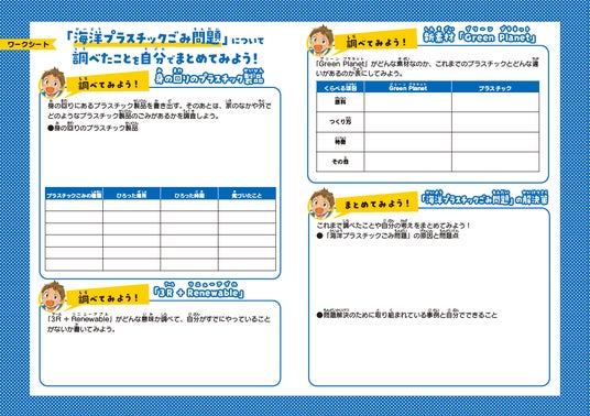 本特集では、海洋問題の中でも特に大きな問題となっているプラスチックごみについて、そして、環境問題のキーワードのひとつである「3R+Renewable」について解説。さらに、サステナブルな環境に配慮したバイオプラスチックの中でも、株式会社カネカの生分解性バイオポリマー「Green Planet(R)」を紹介しています。まとめるのが苦手……という子でも安心のワークシート付きで、必要な情報を迷うことなく調べることができます。単なる調べ学習にとどまらず、問題解決への取り組みを考えられる自由研究となっています。