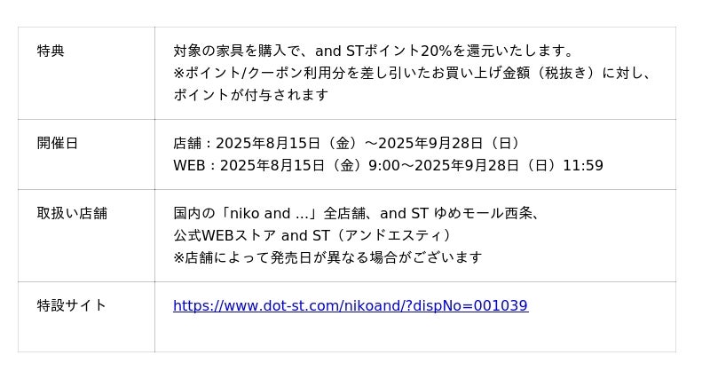 株式会社アダストリア(本部:東京都渋谷区渋谷2-21-1、代表取締役社長:木村 治)が展開するスタイルエディトリアルブランド「niko and ...(ニコアンド)」は、家具・生活雑貨を中心としたインテリアライン「niko and ... FURNITURE & SUPPLY(ニコアンドファニチャーアンドサプライ)」より、N CLASSIC SERIES(エヌクラシックシリーズ)の新作家具6点を2025年8月1日(金)より国内の「niko and ...」の一部店舗と、「niko and ...」公式WEBストア and ST(アンドエスティ)にて販売しています。さらに、2025年8月15日(金)からは国内の「niko and ...」全店舗と、「niko and ...」公式WEBストア and STにて、対象の家具を購入すると、and STポイント20%が還元されるお得なイベントFURNITURE FAIRを開催します。N CLASSIC SERIESの新作家具6点を始め、人気のCLASSIC DINER SERIES(クラシックダイナーシリーズ)のソファや、ラグや照明など、お得にインテリア商品を購入できる機会です。