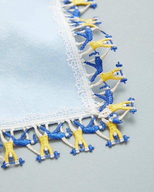 手足を伸ばしヨガにいそしむ女の子と床を踏みしめ、力強くダンベルを上げる女の子。”Sweats!気持ちよく汗をかきましょう!”というメッセージです。ライトブルーが高輪店限定です。