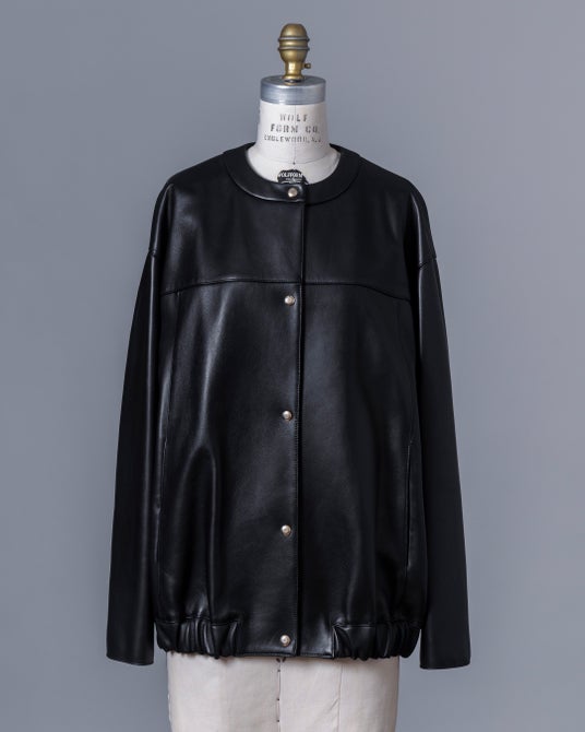 しっとりとした風合いに仕上げたシープスキンを用いたレザージャケット。柔らかなドロップショルダーと丸みのあるシルエットが特徴です。抜け感のあるリラックスしたサイズ感に、ふくらみをもたせたカラーレスの衿が洗練されたアクセントに。