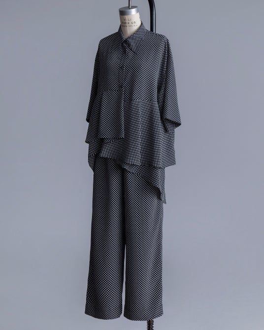 繊細なドット柄が印象的なブラウスとパンツのセットアップ。