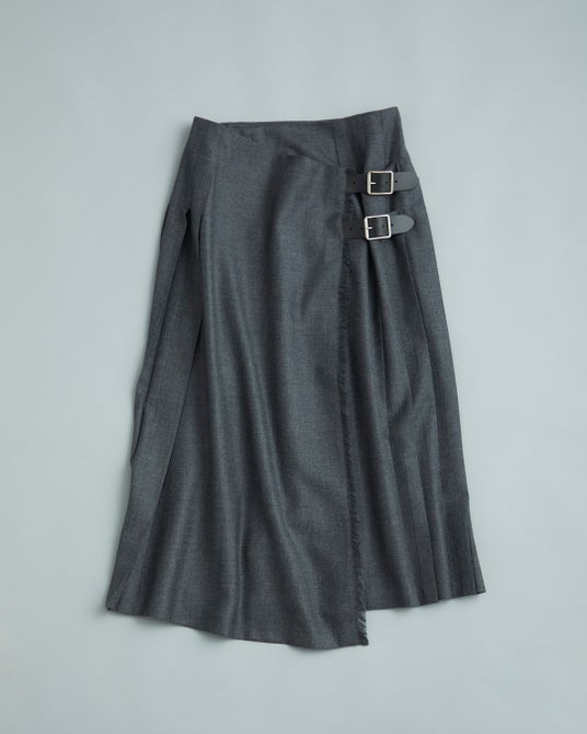 2024 年秋冬シーズンに人気のモデル DIP PANEL スカートを同じカラーで別注しました。アシンメトリーなデザインながら、着丈のバランスや落ち着いたグレーがとても女性らしく、シックな印象のスカートです。