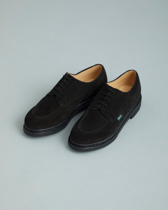 <Paraboot(パラブーツ)>を代表する U チップモデル「シャンボード」。丸みのあるフォルムがいかにもフランス靴らしい一足をブラックスウェードで別注しました。ステッチもブラックに変更することでより上品で都会的な印象に。カジュアルからジャケットスタイルまで、様々なスタイルにマッチします。