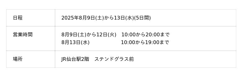 2025年8月9日(土)から8月13日(水)までJR仙台駅2階 ステンドグラス前にて開催