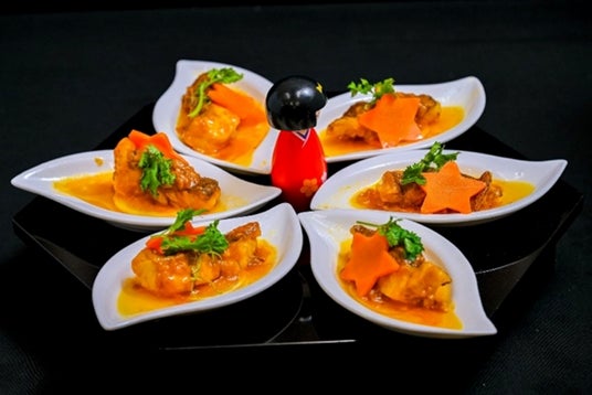 白身魚を香港で親しまれているカレー風味に香り高くし、盛り付けは香港の国旗をモチーフに仕上げました。地元の方々にも親しみと楽しさを感じられよう味わいと視覚的な表現に工夫を凝らした一品です。