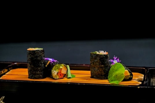 缶詰の鮑に数種類の野菜を合わせ、それぞれの食感を活かした一品です。盛り付けに細やかな工夫を加え、巻きずしに見立てることで日本らしさを表現しました。