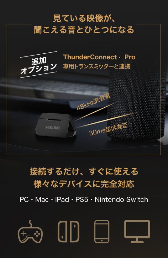 一方、「ThunderConnect(TM) Pro」は、ゲームやライブ配信など、音と映像の高精度な同期が求められるシーンに最適です。Bluetoothとは異なる独立通信システムにより、理論上約30msの超低遅延を実現。さらに、一部のテレビやNintendo SwitchなどBluetooth非対応機器にも対応しており、より安定した接続と即応性を求める方におすすめのオプションです。