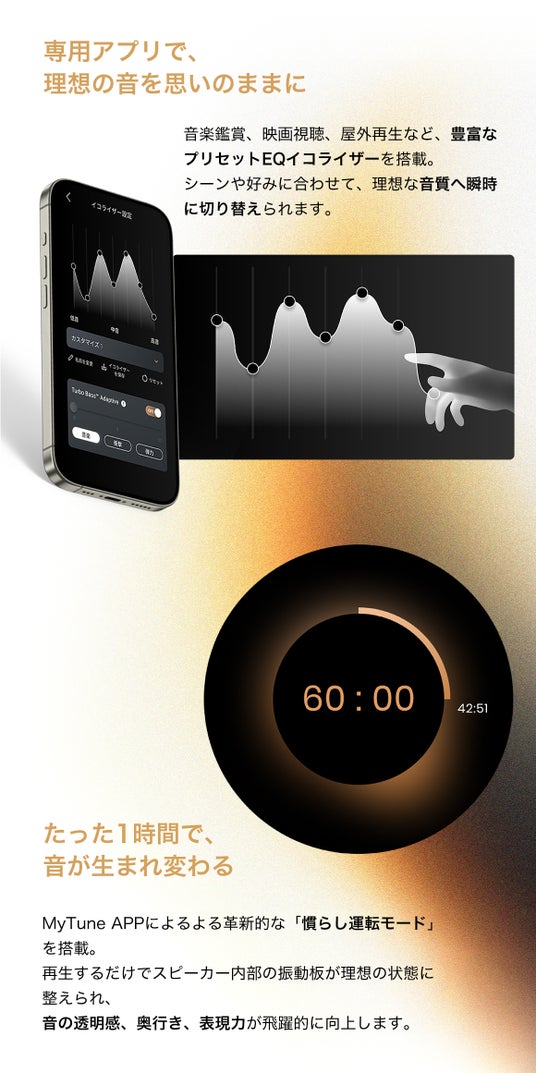 TurboBass Adaptive技術さらに、「TurboBass Adaptive 適応型低周波補修技術」が、再生中の音楽信号をリアルタイム解析。