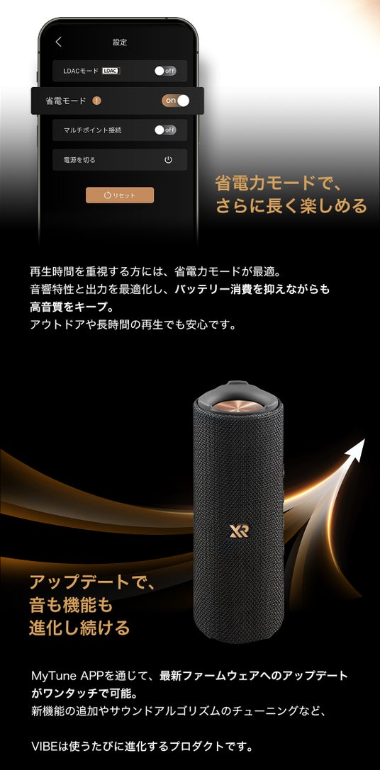 VIBEは、手のひらサイズの筐体にXROUND(TM) 実境サラウンド音響を搭載。音の芯がブレず、開けた屋外でもしっかり聴き取れるパワフルなサウンドを実現します。