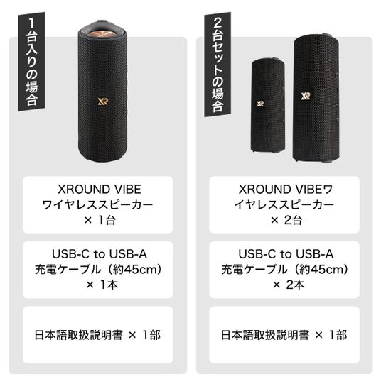 ※サラウンド再生機能は、最大2台のXROUND VIBEによるペアリングに対応しており、自動音場最適化はこのモードでのみ有効です。同一音源を複数台で同時再生できる「ブロードキャストモード(広域伝送モード)」により、3台以上の同時接続が可能です。