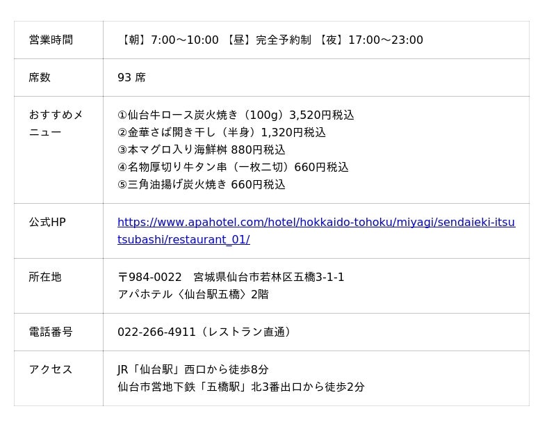 「炭火焼きと三陸海の幸 仙台彩旬」公式HP:https://www.apahotel.com/hotel/hokkaido-tohoku/miyagi/sendaieki-itsutsubashi/restaurant_01/
