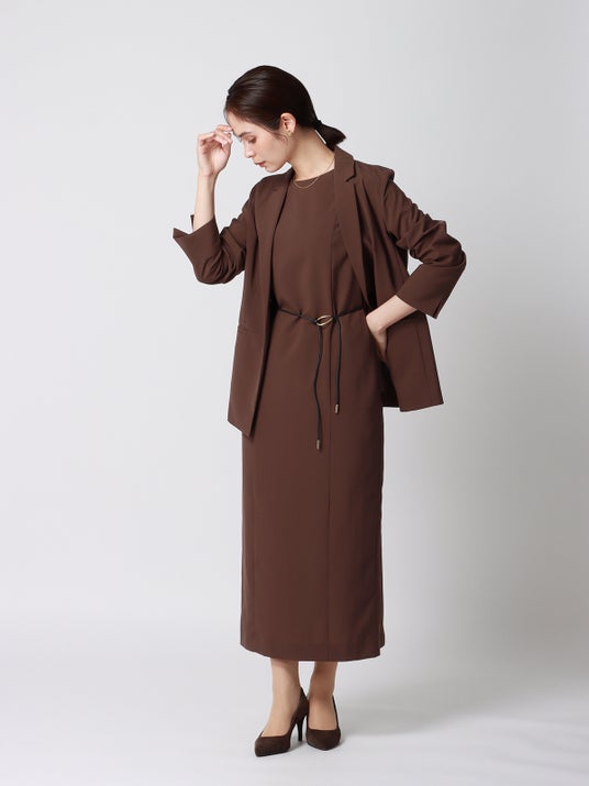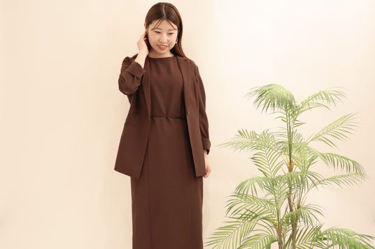 左:同素材のジャケット+ワンピース合わせできちんと感を演出。