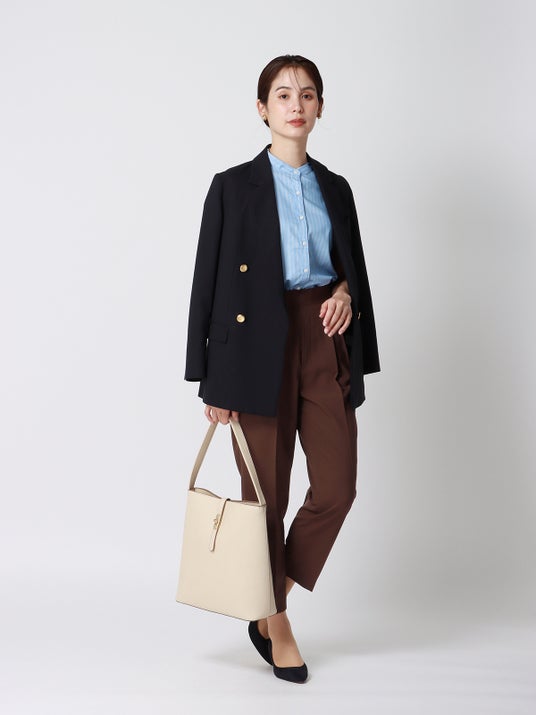 右:オーソドックスな紺ブレスタイルに秋色パンツで季節感を先取り。