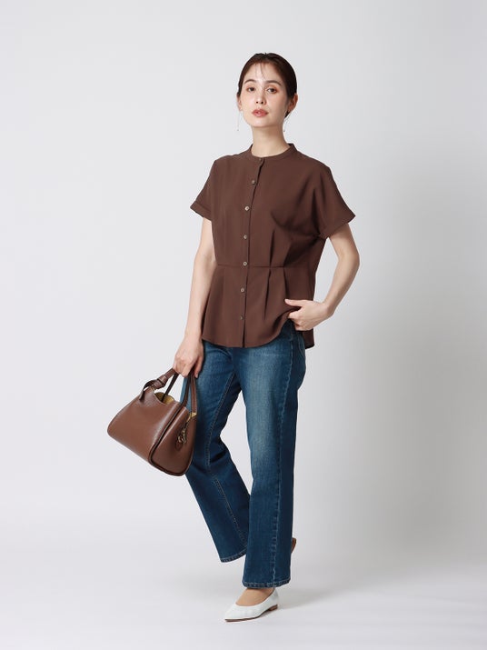 左:ウエスト切替とタックで表情のあるブラウスはカジュアルなデニム合わせでも気映え効果抜群。