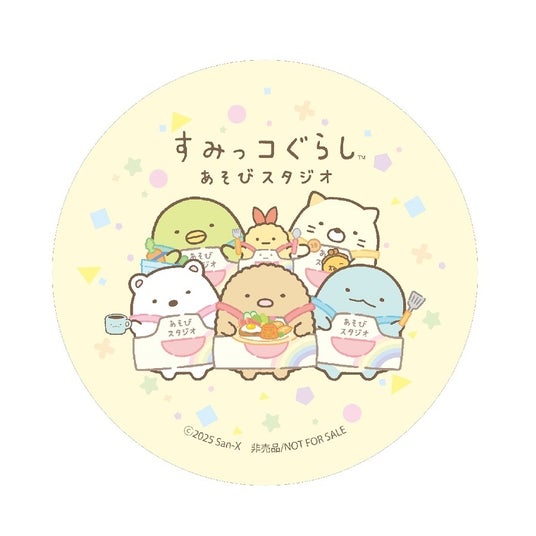 入場したお子さまに数量限定で、あそびスタジオ オリジナルアートの「オープン記念シール」をプレゼントします。お子さまが施設で着られるあそびスタジオオリジナルエプロンをすみっコたちも着たかわいいデザインです。