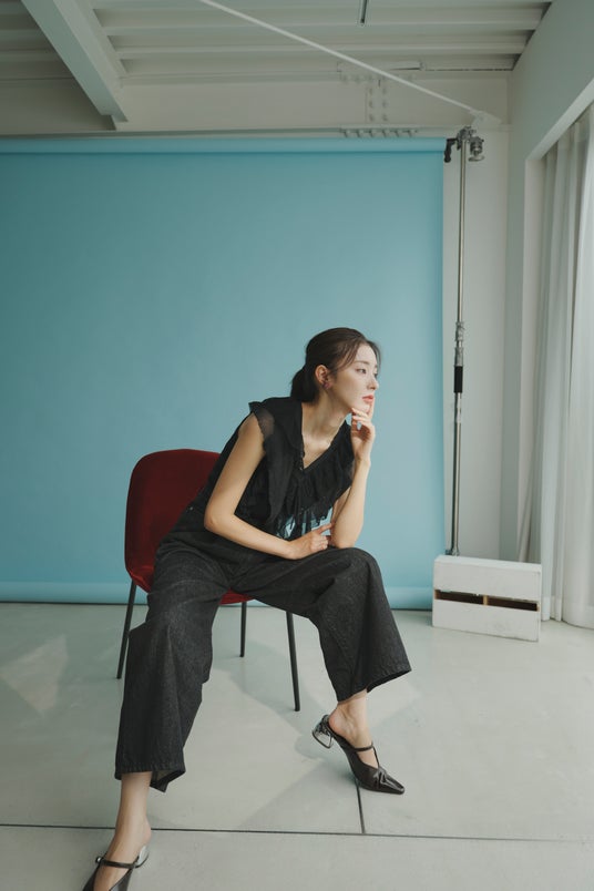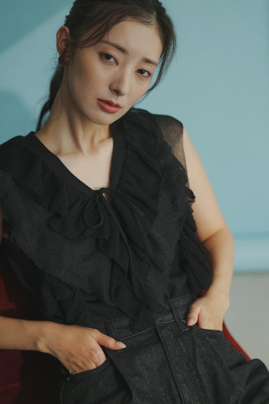 フリルブラウスも一癖あるメッシュ素材で甘さをモダンに調整。
