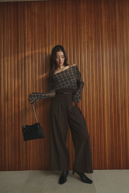 秋らしいこっくりカラーのトップスに、タック入りのパンツでバランスよく。クラシックな雰囲気の中に品格が漂う一枚。