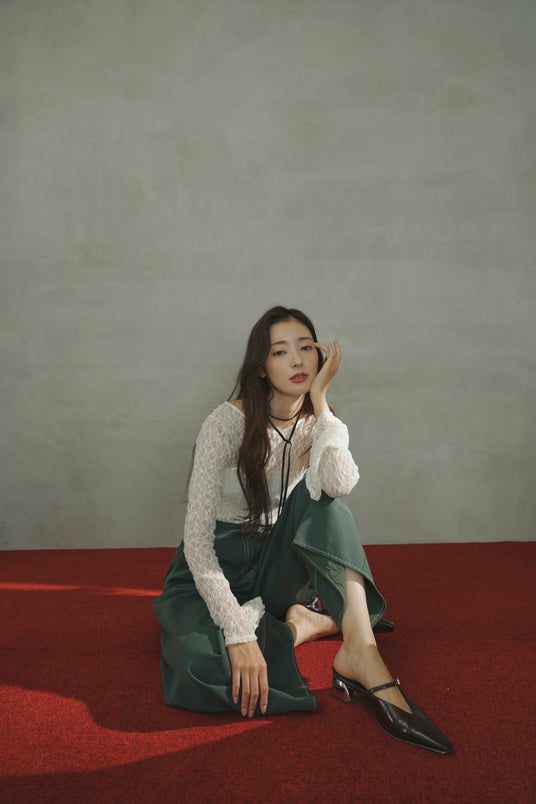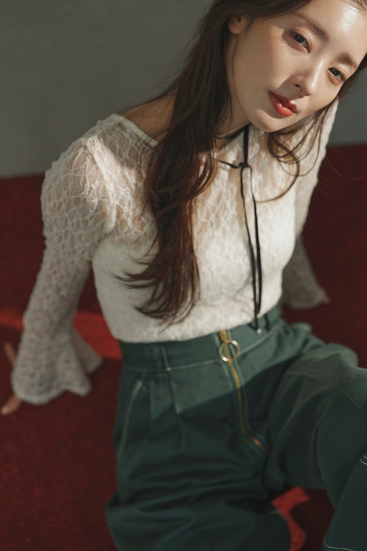 透け感のあるレーストップスが、凛とした大人の女性らしさを引き立てる。