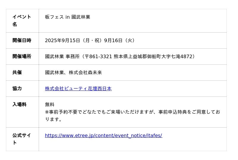 「Sustainable Forest」をミッションとする株式会社森未来(本社:東京都港区、代表取締役:浅野純平、以下:森未来)は、熊本を拠点に活動する國武林業(本社:熊本県上益城郡御船町、代表:國武 智仁)と共催で、2025年9月15日(月・祝)、9月16日(火)に、「板フェス in 國武林業」を熊本県上益城郡御船町にて開催いたします。