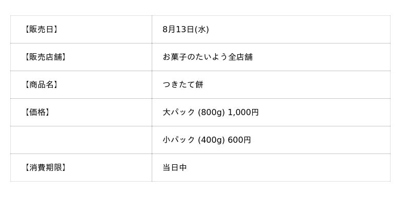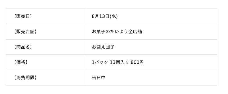 株式会社太陽社(所在地:千葉県匝瑳市飯倉293、代表取締役:片岡正裕)が展開する千葉県で長年愛される菓子店「お菓子のたいよう」は、2025年のお盆の中日8月13日(水)に合わせて、心を込めた手づくりの『つきたて餅』と『お迎え団子』を、数量限定で販売いたします。