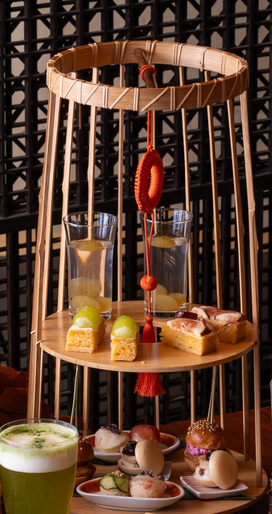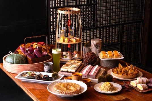 本イベントでは秋を代表する味覚--葡萄、柿、洋梨、芋、栗、南瓜などをふんだんに取り入れたスイーツやセイボリーを大人気のブッフェとティースタンドの2つのスタイルでご提供。食べ放題のケーキ類や軽食に加え、お席までお届けするティースタンドでは、旬の果物を使った華やかなタルトや、和風バーガー、一口サイズのてまり寿司など、日本料理・東山ならではの和の趣を感じさせるセイボリーをご用意しています。