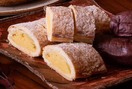 甘みたっぷりの薩摩芋のペーストと、アーモンドクリームを合わせ、パイ生地で包んで焼き上げました。まわりはサクサク、内側はしっとりの絶妙な食感がたまりません。