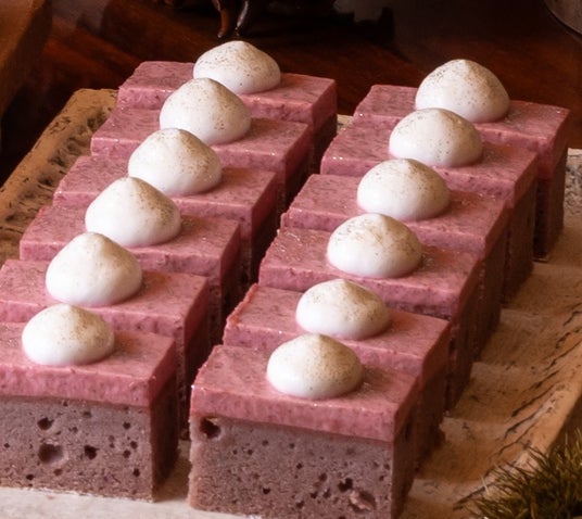 ほんのり紫に色づく紫芋入りパウンド生地に甘酸っぱいグリオットチェリークリームのムースを重ね、シルバーのパウダーをかけた、おしゃれな一品です。