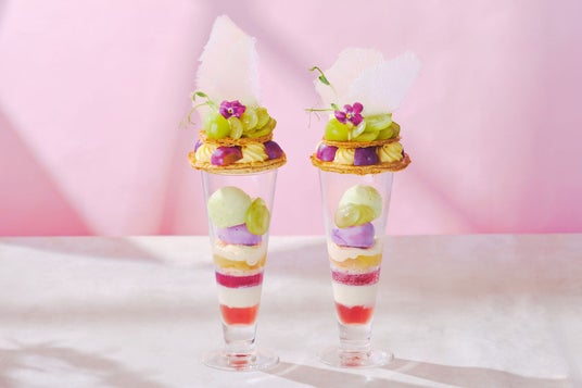 グラス上部は、美しい飴細工とシャインマスカット、サクサクに焼き上げたパイ生地にみずみずしいぶどうとなめらかなカスタードが重なり合い、それぞれの素材の良さを引き立て、一体感のある美味しさを堪能できます。グラス内部は、さわやかな味わいの葡萄とマスカットのアイスと、透明なグラスに重なるぶどうのゼリー、パンナコッタ、洋梨のコンポートが美しい層を織りなし、上品なグラデーションを生み出します。