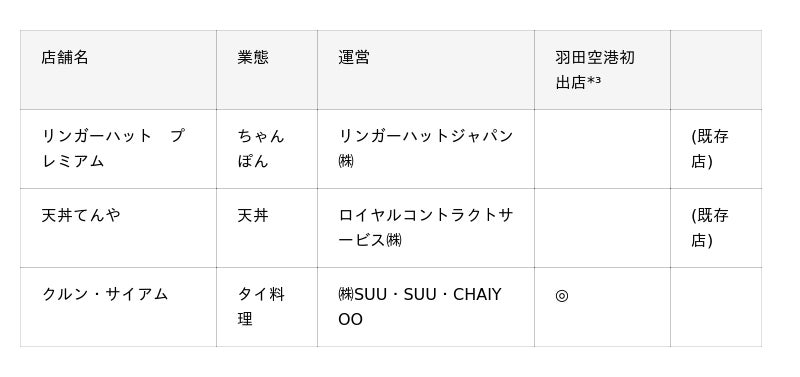 出店店舗については、国内外から高い評価を得ており、予約が取れない名店として知られている東京割烹「くろぎ」の黒木純氏が監修したとんかつ専門店「廚 くろぎ じゅんちゃん」や、ミシュランガイドの星を獲得するなど、世界的に高い評価を得ている銀座おのでらによる新業態の海鮮丼専門店「海鮮丼 銀座おのでら 羽田空港第一ターミナル店」、ジェラートの発祥地イタリア・フィレンツェの老舗ジェラートショップ「Badiani」(関東初出店)の11店舗が羽田空港初出店*²。