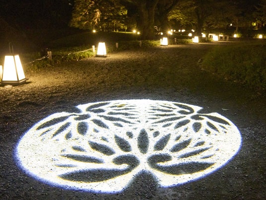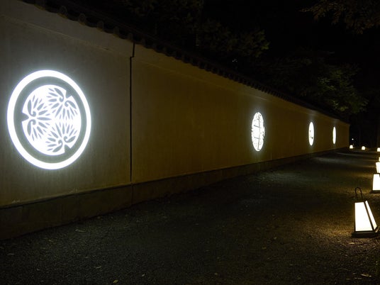 松原から内庭へと向かう園路の白壁に、小石川後楽園の家紋と和の紋様の影絵が浮かび上がります。