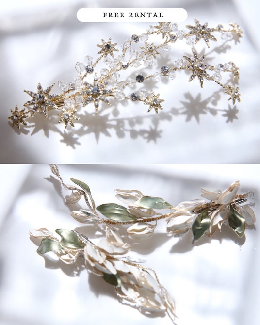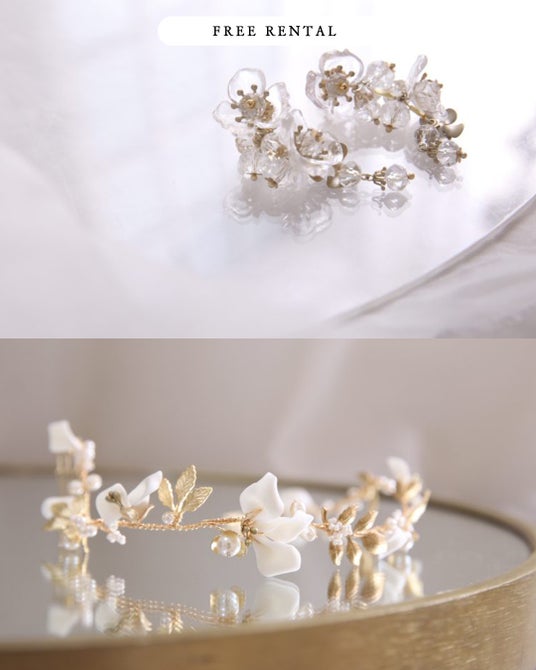 当店では、熟練のバイヤーが厳選した、他では出会えない特別なプレミアアクセサリーをご用意しております。繊細な輝きを放つティアラ、顔周りを華やかに彩るベールなど、一つひとつが職人の手によって丁寧に作られた逸品です。