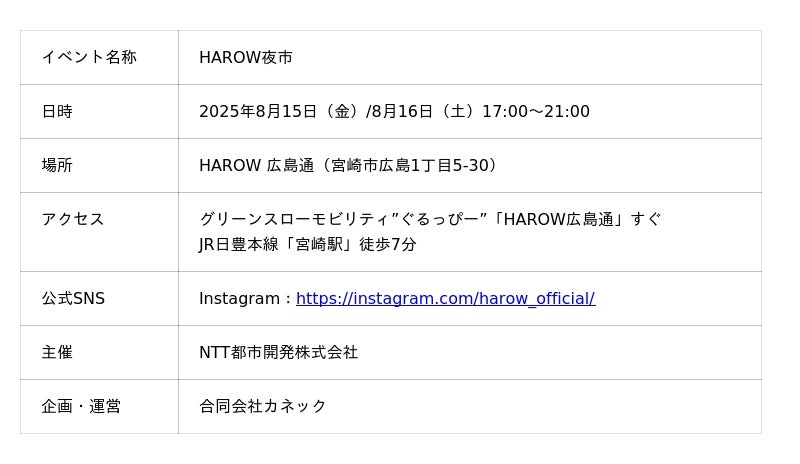 NTT都市開発株式会社(本社:東京都千代田区、代表取締役社長 池田 康)は、複合商業施設「HAROW」(宮崎県宮崎市広島1丁目)にて、アジアの夜市の賑わいを再現した特別イベント「HAROW夜市」を、8/15(金)・8/16(土)の2日間にわたって開催します。ぜひお気軽にお越しください。