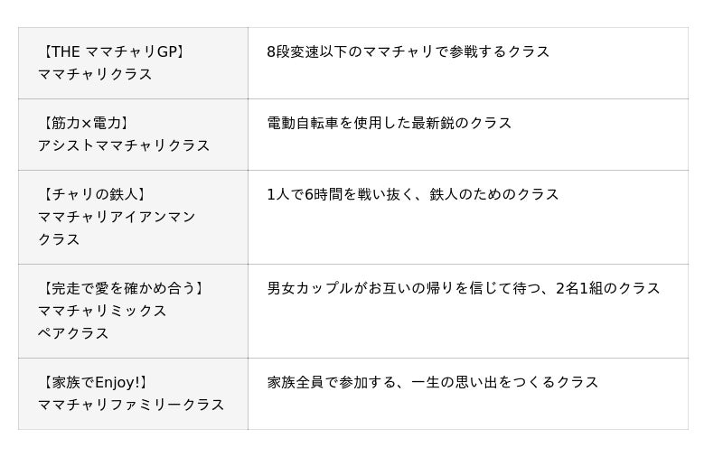 例年同様、THE ママチャリグランプリ!とも言える定番のクラスから、名称を変更してリニューアルしたクラス、そして参加者のニーズ増大による新設クラスなど、今年は合計5クラスで皆さまのエントリーをお待ちしております。