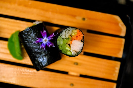 缶詰の鮑に数種類の野菜を合わせ、それぞれの食感を活かした一品です。盛り付けに細やかな工夫を加え、巻きずしに見立てることで日本らしさを表現しました。