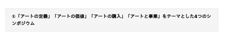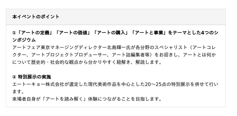 本イベントはシンポジウムと特別展示で構成されます。シンポジウムは、「アートの定義」「アートの価値」「アートの購入」「アートと事業」の4つのテーマで開催され、各分野のスペシャリストと共にアートの価値や役割をじっくりと解き明かします。加えて、期間中には来場者が“アートを読み解く”ことを体感できる特別展示も行います。個人の感性の発露ではなく、社会的な事象、社会科学や思想史と結びつけながら鑑賞いただけるよう、「アートを読解する」をテーマに展示を実施いたします。