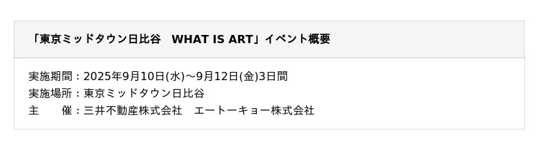 三井不動産株式会社(東京都中央区、代表取締役社長:植田俊)は、東京ミッドタウン日比谷 (千代田区有楽町、事業者:三井不動産株式会社)で、2025年9月10日(水)~12日(金)の3日間、「東京ミッドタウン日比谷 WHAT IS ART」を開催いたします。本イベントは、日比谷と隣接する有楽町で開催している「アートフェア東京」を企画・運営するエートーキョー株式会社との共催となります。