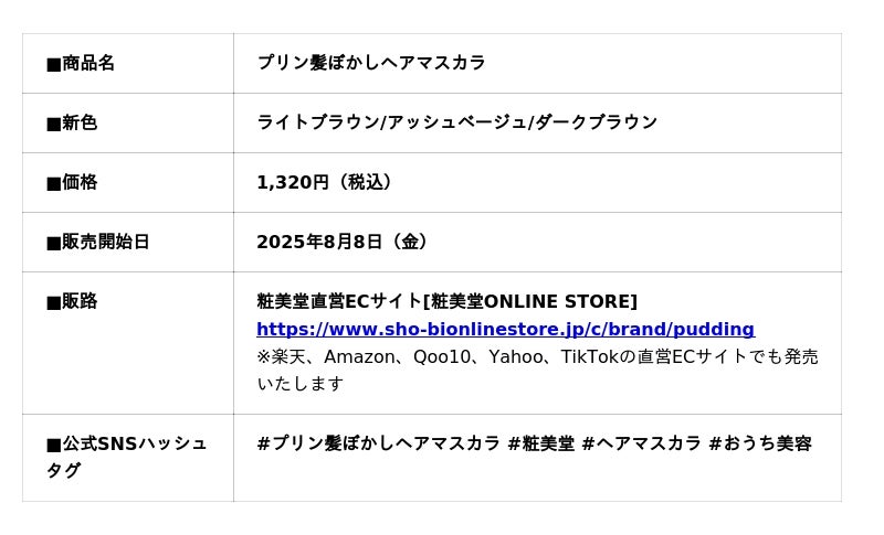 化粧品、化粧雑貨、服飾雑貨及びキャラクター雑貨等の企画・製造・販売、コンタクトレンズの企画・販売を行う粧美堂株式会社(本社:東京都港区、代表取締役社長:寺田正秀、以下 粧美堂)は、根元のプリン髪をひと塗りで目立たなくできる『プリン髪ぼかしヘアマスカラ』の新色3色を、2025年8月8日(金)より直営ECサイト『粧美堂オンラインストア』限定で発売いたします。