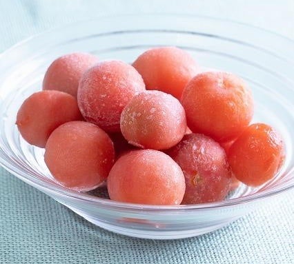 旬の時期に安くなるミニトマト。保存袋に入れて冷凍しておけば、1カ月ほど日持ちします。糖度があるので堅くなりすぎず、シャーベットのような食感。ミニトマトは凍ったまま水にくぐらせると簡単に皮もむけます。