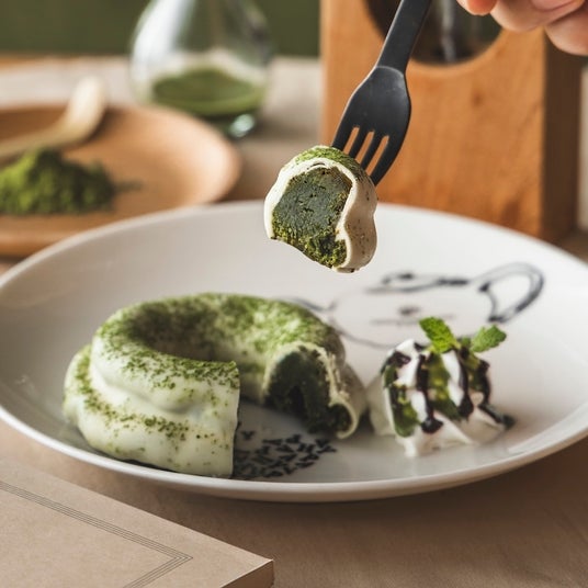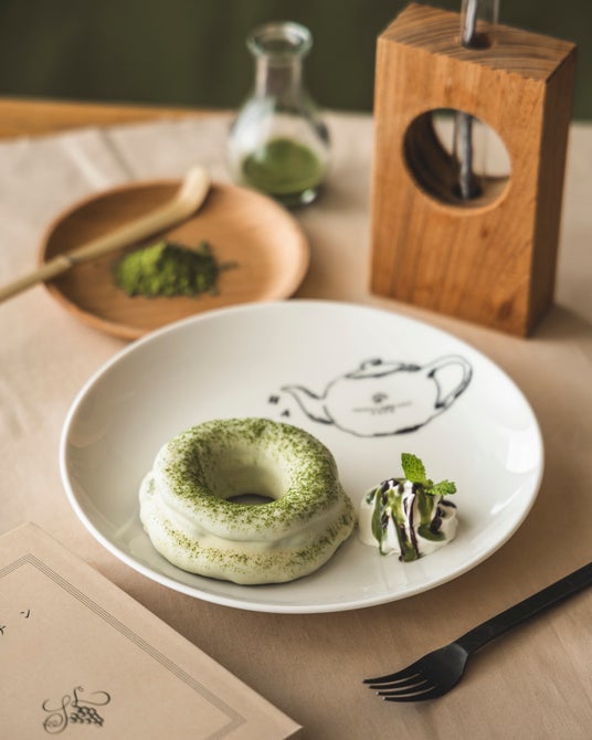 生地を数日間寝かせて作る、ガトーショコラのようなしっとり食感の人気ドーナツから伊藤久右衛門の抹茶をふんだんに使用した限定フレーバーがイートイン限定で登場。表面にはパリッと食感のホワイトチョコレートをたっぷりとコーティングし、抹茶パウダーを散らしました。