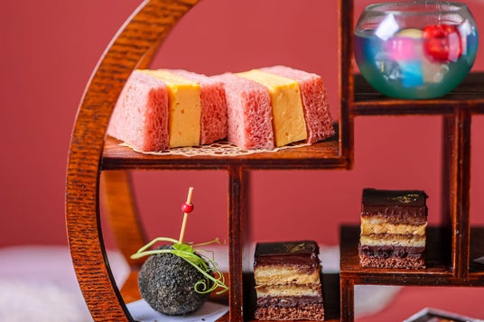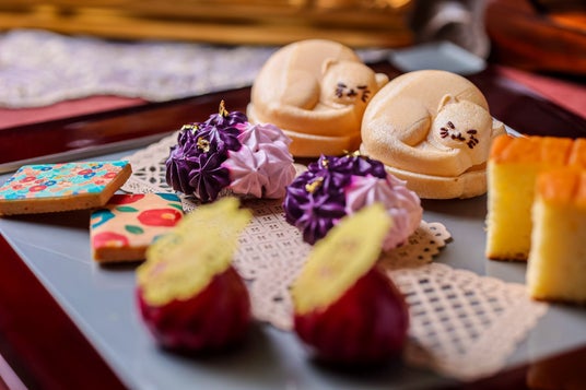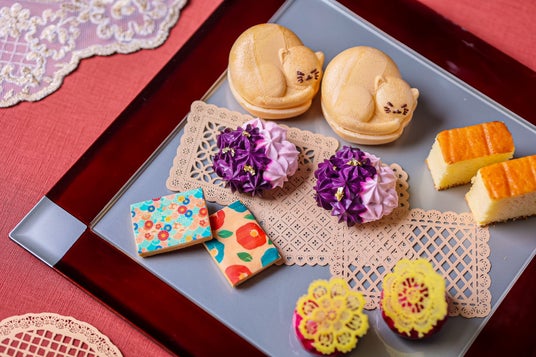 木製スタンドとスクエアプレートに並ぶスイーツは、栗の甘露煮やこし餡、マロンクリームを挟んだ可愛らしい猫型の最中や、繊細な花型のチュイルをあしらったキャラメル風味のりんごムース、白餡ベースの紫芋でデコレーションした大福、カラフルな花柄が目を惹く和風クッキー、ザラメ入りのしっとりとしたカステラ、カラフルな寒天入りのクリームソーダ風ジュレ、コーヒー風味のオペラケーキ、色とりどりの金平糖など計8種のスイーツをご用意。ラズベリーとビーツを練り込んだピンク色の食パンの厚焼き玉子サンドや、竹炭の衣で揚げた牛肉入りコロッケ、じっくりと炒めて玉ねぎの甘味をだしたオニオンスープのセイボリー3種も一緒に味わえます。