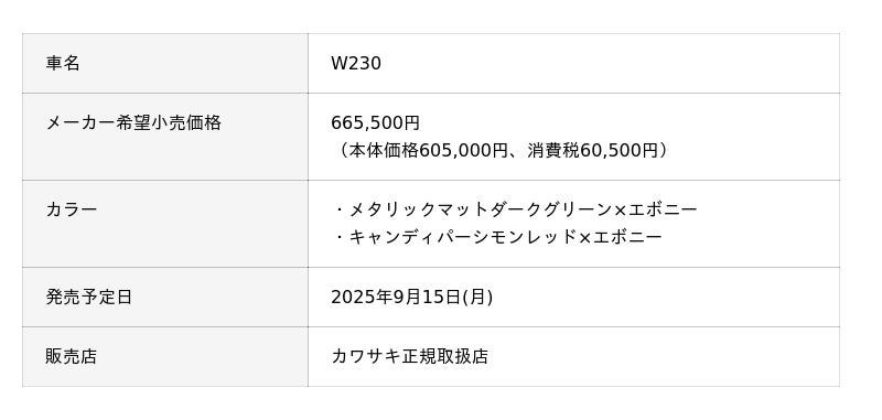 株式会社カワサキモータースジャパン(本社:兵庫県明石市、代表取締役社長:佐伯 健児)は、「W230」のカラー&グラフィックを変更し、2025年9月15日(月)に発売いたします。