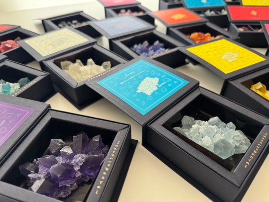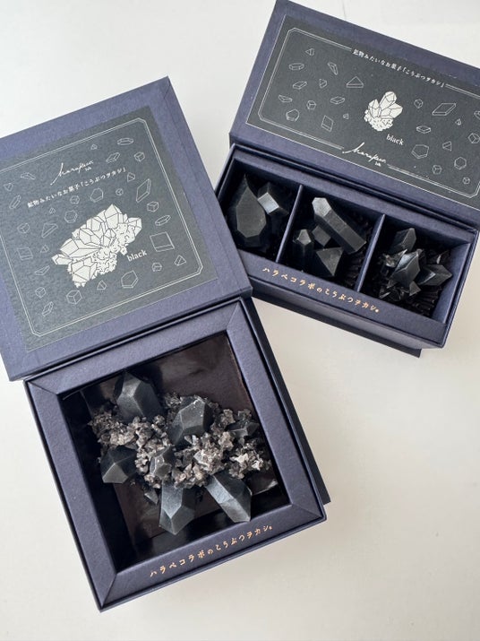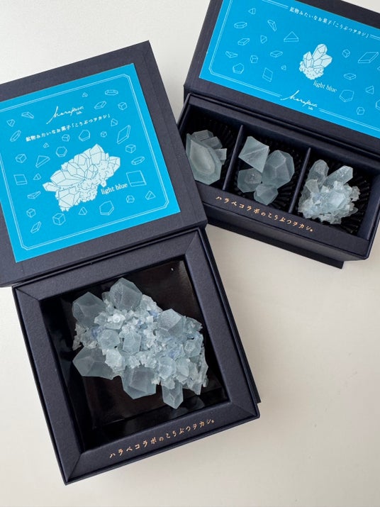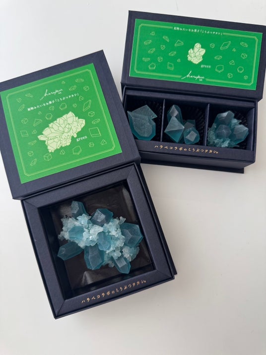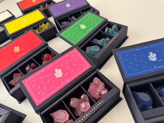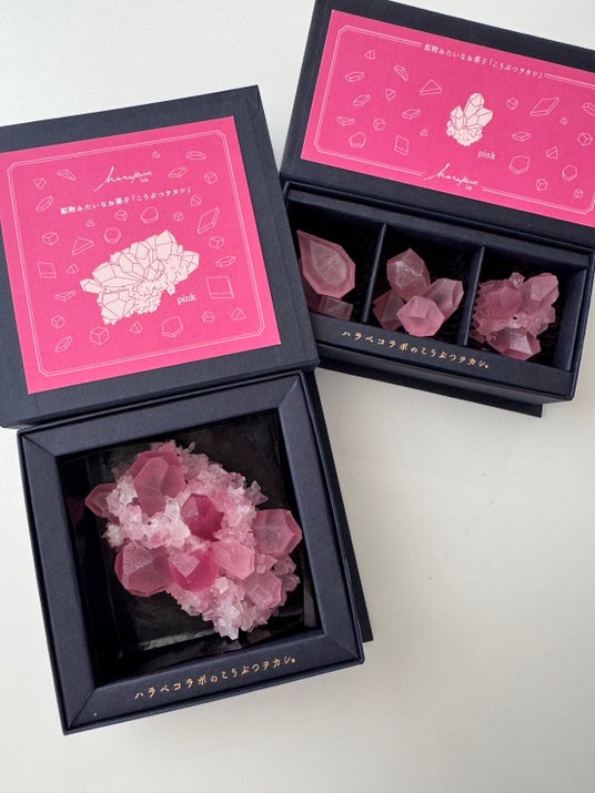 今回登場するのは、“自分の推し”や“大切な人の好きな色”を選んで楽しめる全10色展開のこうぶつヲカシ。宝石や鉱物をモチーフにした琥珀糖は、職人がひとつひとつ小刀で切り出して丁寧に仕上げ、まるで本物の鉱石のような透明感と輝きを放ちます。デザインは2種