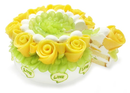 パリッとして食感の良いシャインマスカットと、マンゴーで作った美しいバラを、スポンジや生クリームと合わせて飾りました。チョコレートで作ったLINEアイコンと共に、感謝の気持ちを込めて作りました。